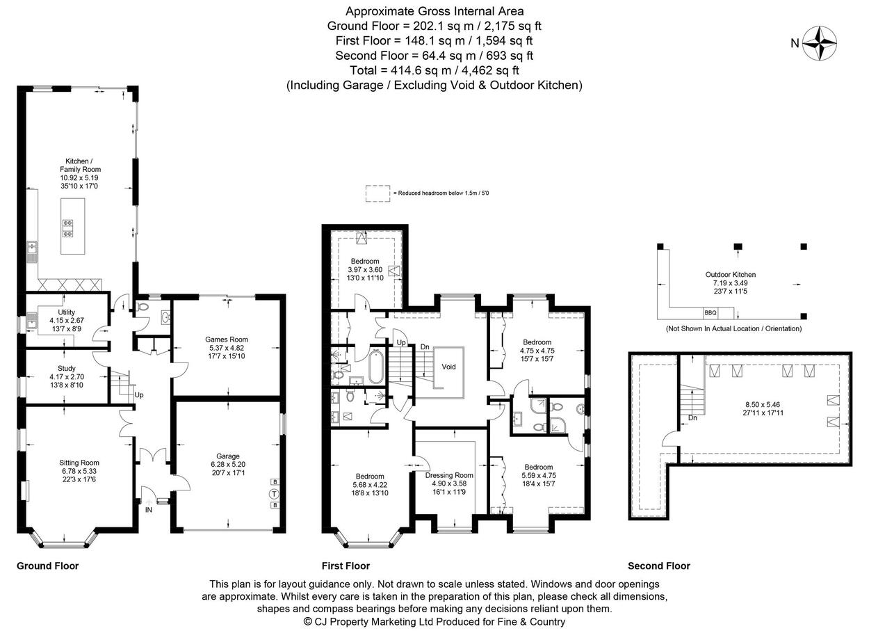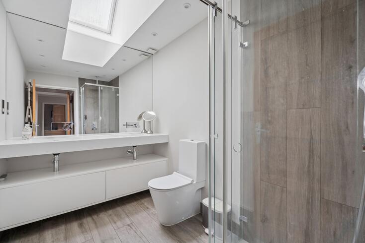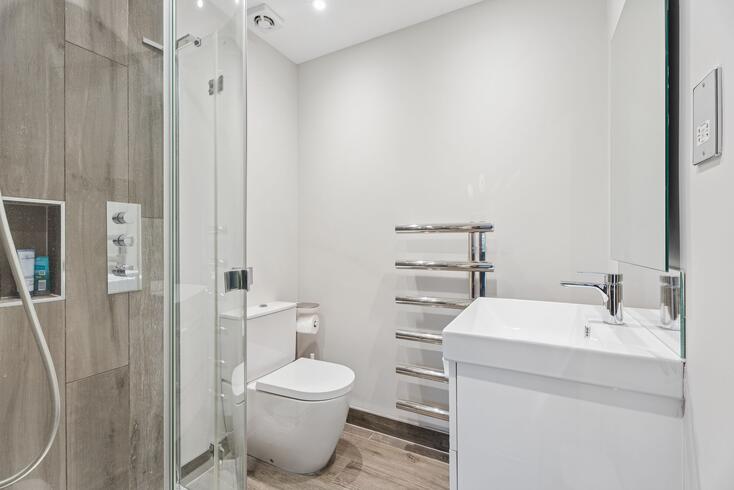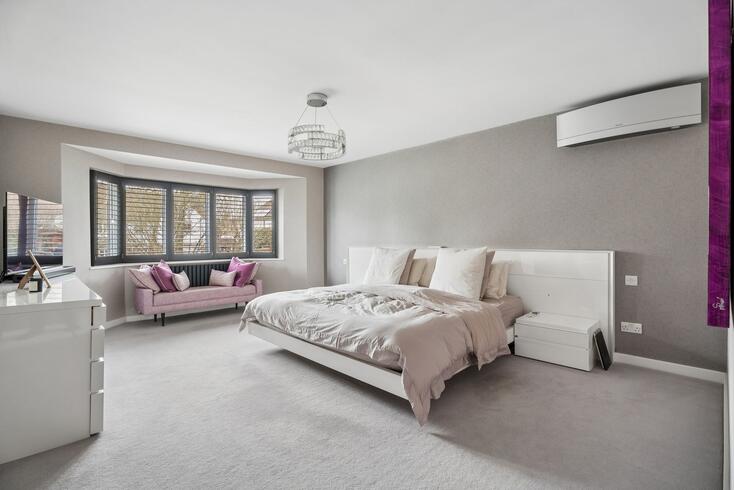 Upstairs, the impressive principal suite features a fully fitted dressing room with ample storage and a luxurious en-suite shower room. The guest bedroom also benefits from its own dressing room and en-suite bathroom, while two further generous double bedrooms each enjoy en-suite shower rooms.