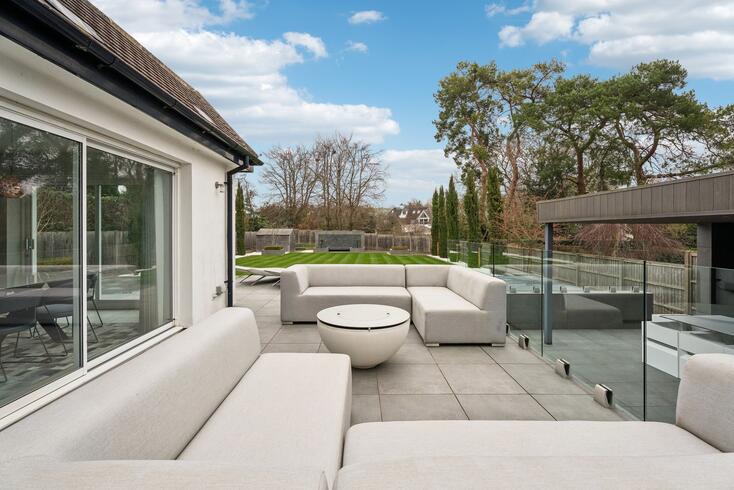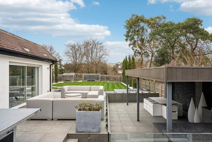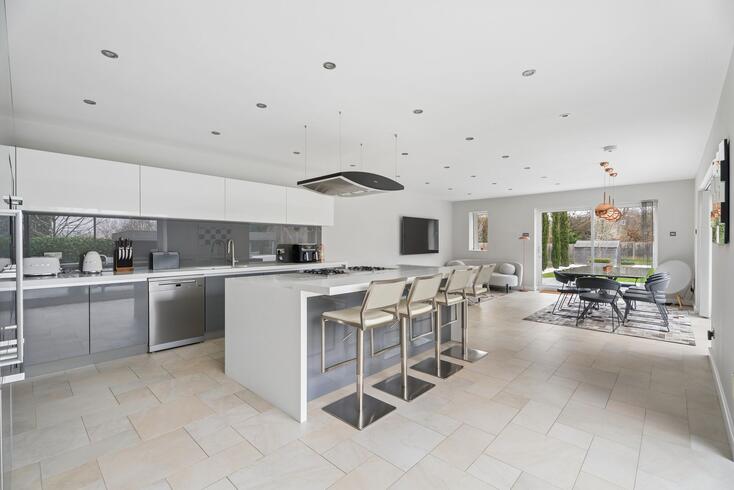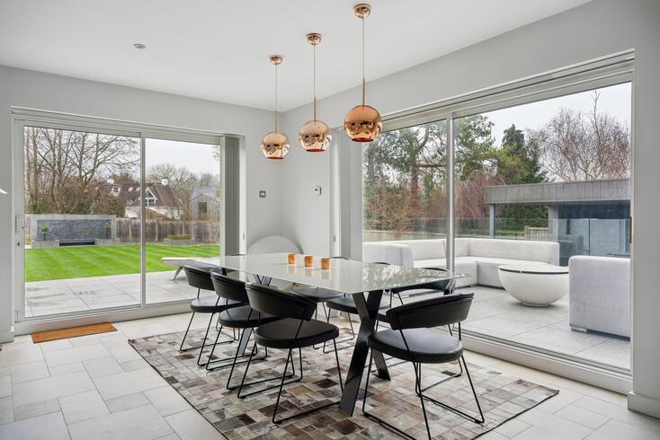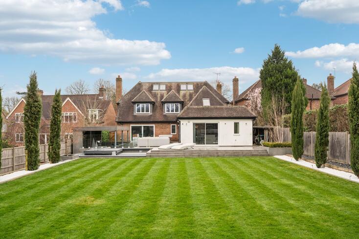 To the rear, the outstanding open-plan kitchen, dining and family room forms the heart of the home and an exceptional entertaining space. Bathed in natural light from expansive sliding glass doors, this stunning room enjoys uninterrupted views over the terrace and beautifully landscaped garden beyond.