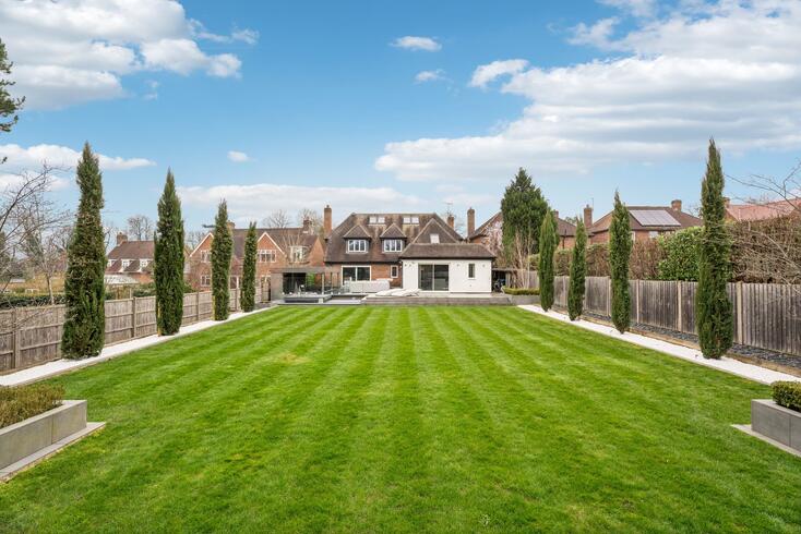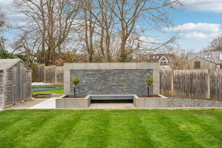 The rear garden features an expansive lawn, a striking feature wall with integrated seating and raised flower beds, and a sunken trampoline tucked away at the far end of the garden.