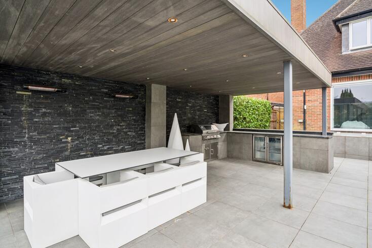 Outside, the property truly excels with an outstanding entertaining space. A large terrace extends from the kitchen via sliding doors, creating a seamless indoor-outdoor lifestyle and the perfect setting for relaxing or hosting guests. The impressive sunken and covered outdoor kitchen and dining area is fitted with a built-in BBQ, fridges and storage, while outdoor heaters allow this exceptional space to be enjoyed well into the cooler months. There is also a hot tub that has been lowered into the ground to maintain the clean lines of this entertaining space. Composite decking surrounds the hot tub, ensuring safe and secure footing on entry and exit.