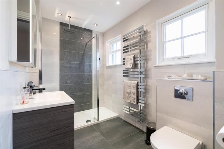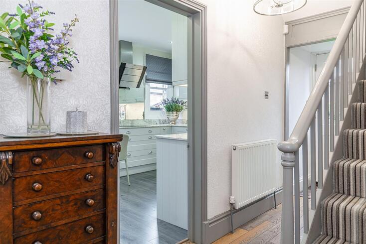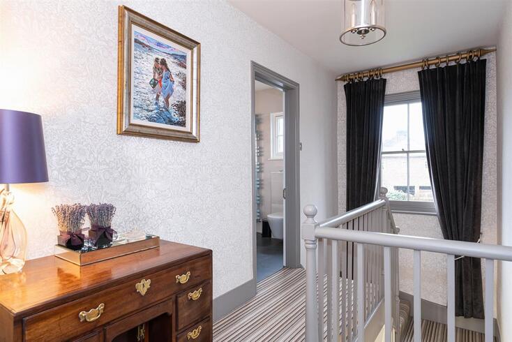 On the first floor, the principal bedroom benefits from an attractive bay window, a beautifully fitted dressing room and en-suite facilities. There are two further double bedrooms and a family bathroom.